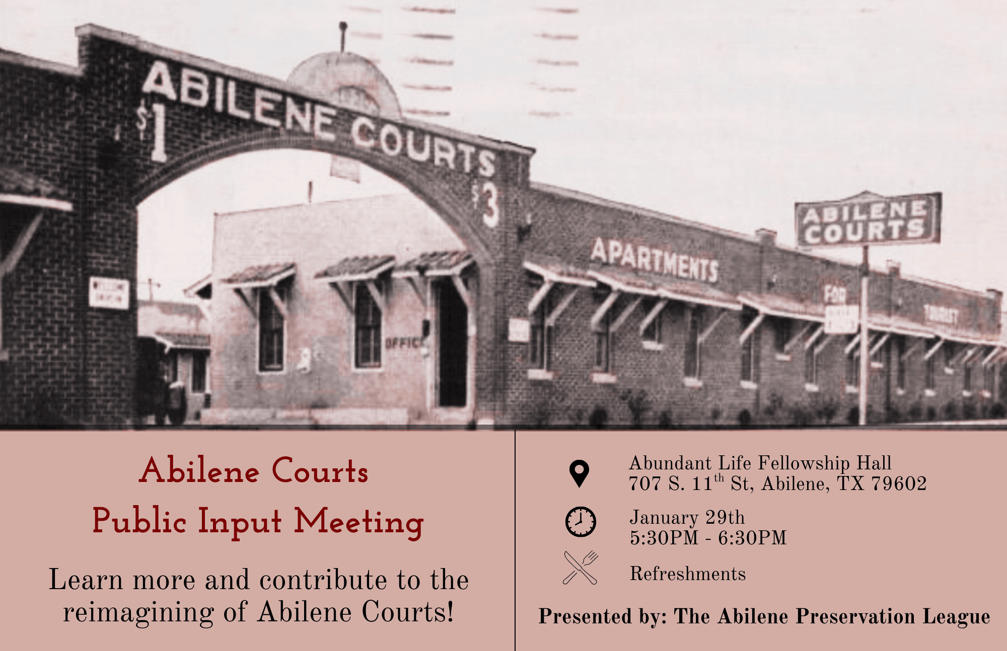 Learn more and contribute to the reimagining of Abilene Courts! APL invites the community to a public meeting to share input on the project. We especially encourage citizens and local business owners from the immediate neighborhood to attend.
