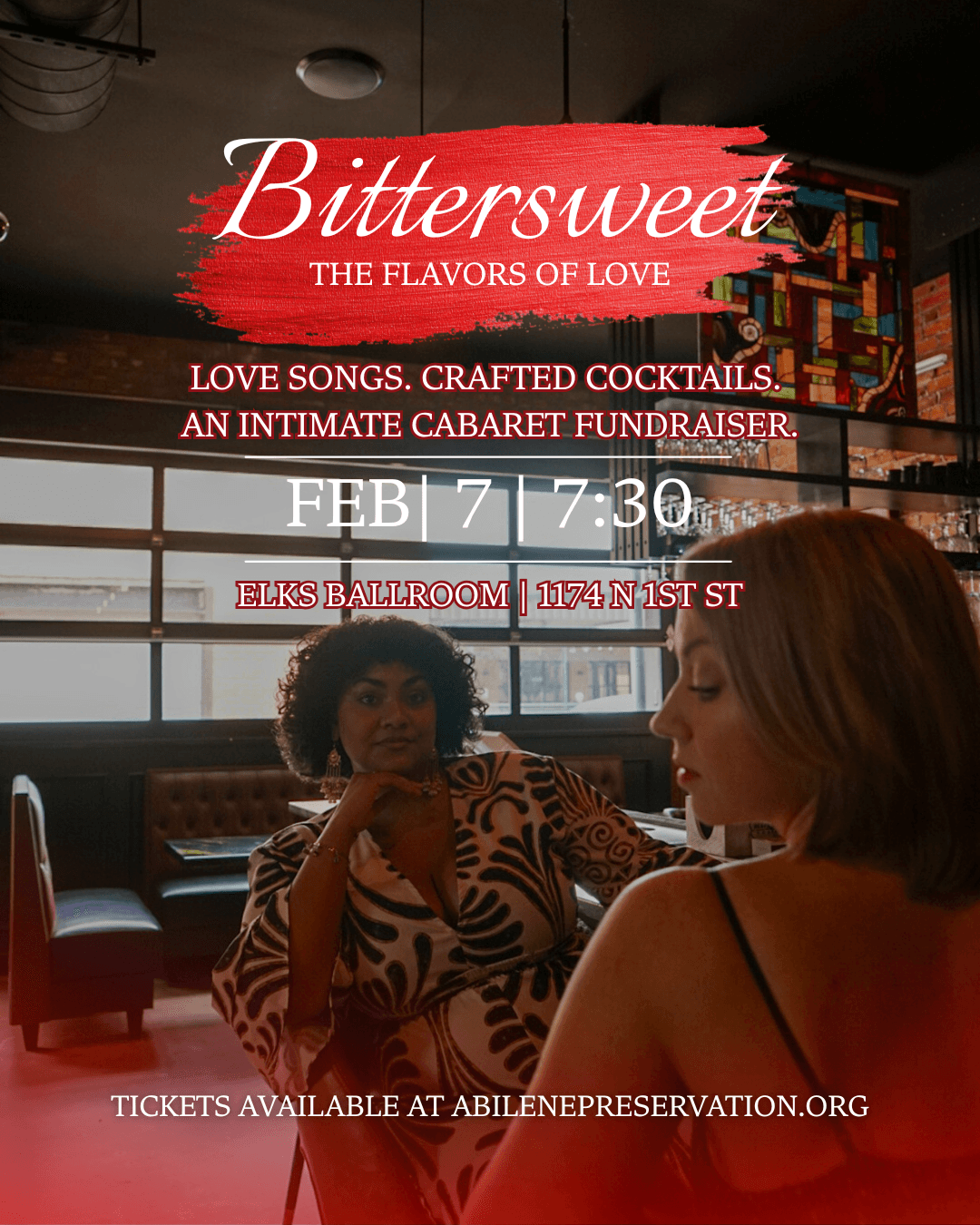 Join us for this delicious fundraiser for the Abilene Preservation League! Singer/pianist duo Serayah Peters and Abigail Payne present "The Flavors of Love." Each set of songs will be paired with a cocktail (sweet, bitter, etc.) to enjoy as you ponder the different aspects of love.