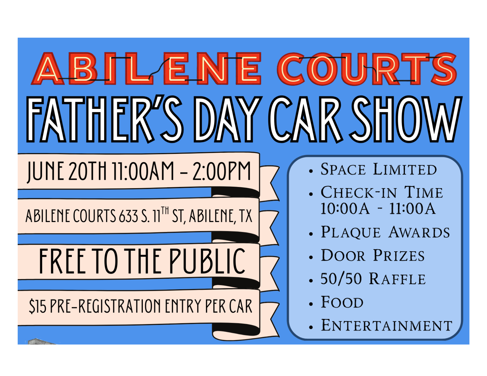 Bring out the classic cars for our first annual Abilene Courts Father’s Day Car Show Fundraiser.